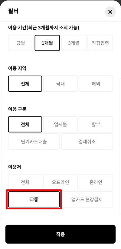 최근 이용내역 화면이 나오면, 여기에서는 일반적인 카드 이용내역만 확인이 가능한데요. 여기서 교통카드 이용내역 확인을 위해서는 다시 상단 오른쪽 필터 메뉴를 선택한 다음, 필터 화면에서 아래쪽 '이용처' 부분에서 '교통' 항목만 선택한 다음, 적용 버튼을 선택해 줍니다.