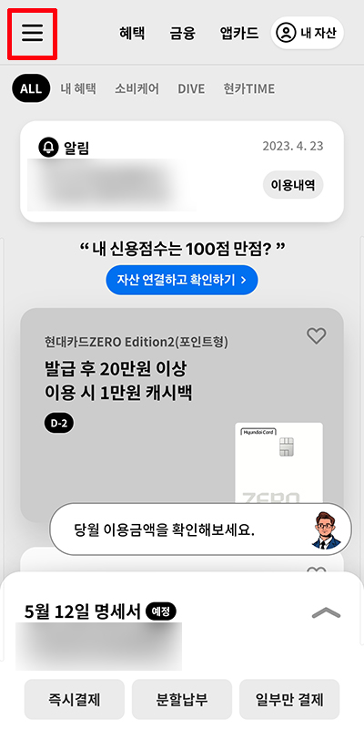 우선 현대카드 앱을 실행한 다음, 첫 화면에서 상단 왼쪽 삼선메뉴를 선택해 주세요. 그리고 여러 메뉴항목들이 나오게 되는데, 여기서 '최근 이용 내역' 항목을 선택해 줍니다.