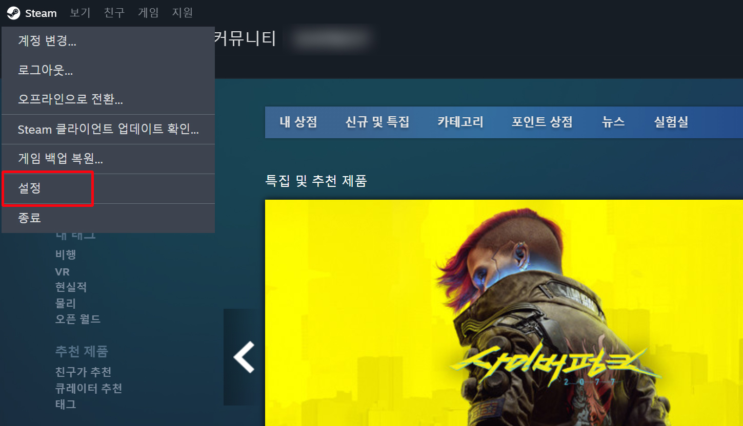 우선 스팀 앱을 먼저 실행해 주고요. 상단 메뉴에서 Steam 항목을 클릭하여 아래로 보이는 항목들 가운데, 설정 항목을 선택해 줍니다.