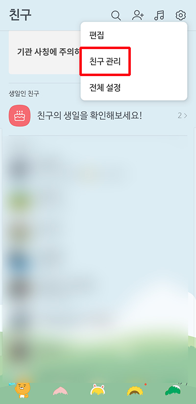 우선 카톡 앱을 실행한 다음, 하단 제일 왼쪽 친구 항목을 선택한 다음, 상단 오른쪽 설정 버튼을 선택하여 '친구관리' 항목을 선택해 주세요.
